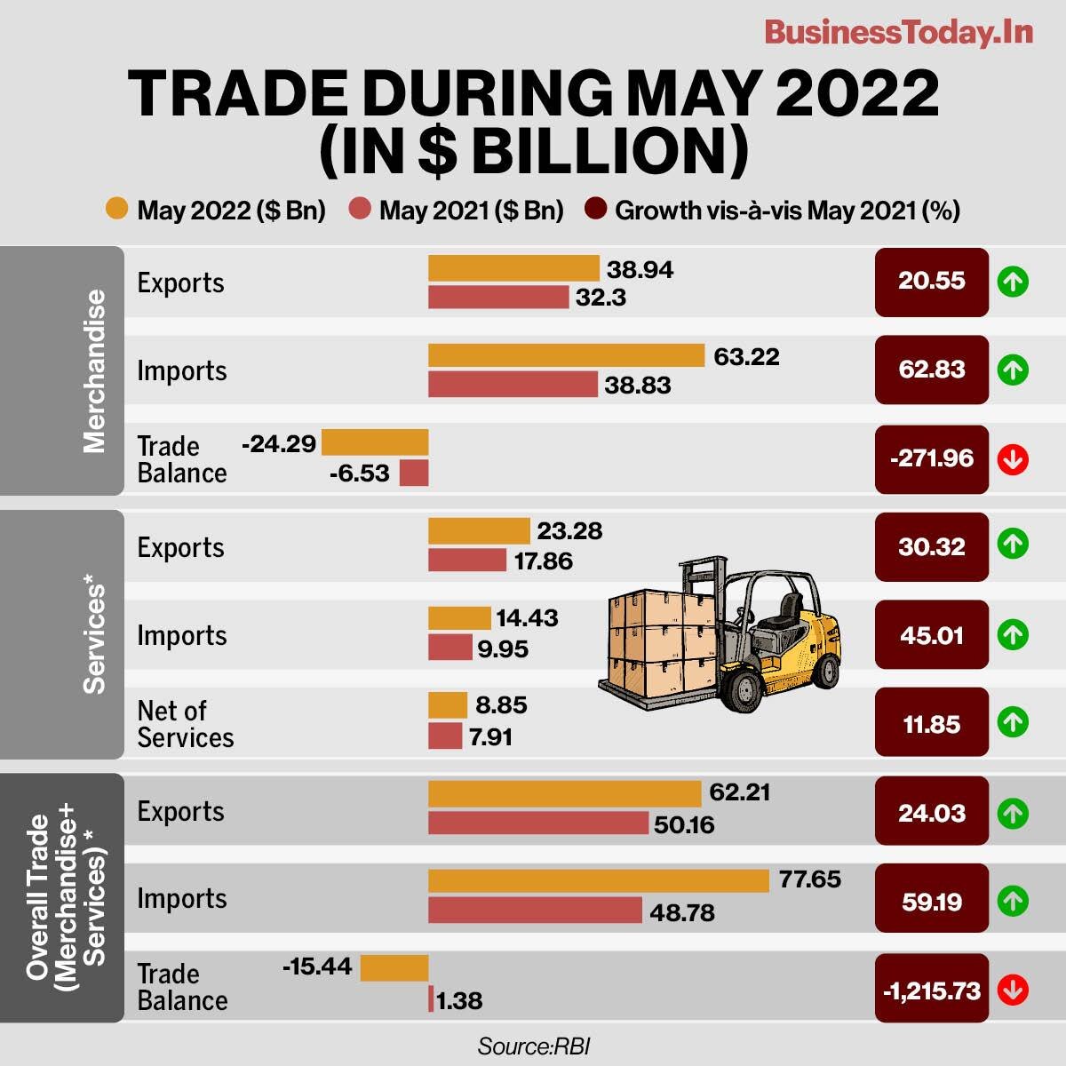 Imports in the month of May grew by 62.83 per cent to $63.22 billion, the data showed. Services export, however, saw an annual growth of 30.32 per cent from $17.86 billion in May last year to $23.28 billion in this year.