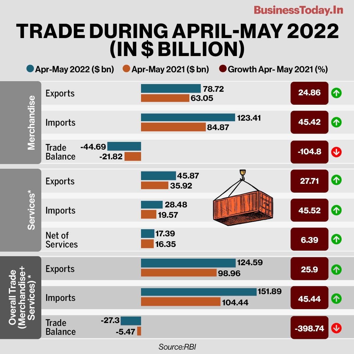On the other hand, overall imports went up 59.19 per cent on-year from $48.78 billion in May 2021 to $77.65 billion in May 2022. Overall imports stood at $151.89 in April-May 2022 versus $104.44 billion in the corresponding period last year, a growth of 45.44 per cent.