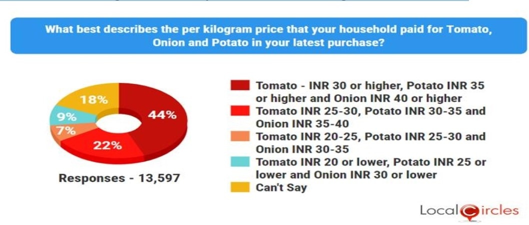 Of 13,597 consumers who responded to the question 44% stated that they bought “tomato for Rs 30 or higher, potato Rs 35 or higher and onion Rs 40 or higher” per kg; 22% of consumers indicated that they bought “tomato for Rs 20-30, potato Rs 30-35 and onion for INR 35-40”; 7% indicated that they bought “tomato for Rs 20-25, potato for Rs 25-30 and onion for Rs 30-35” per kg.