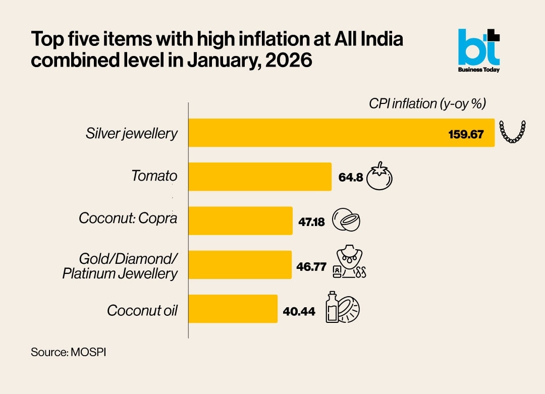 Since the prices of gold and silver touched record highs, retail inflation in both silver and gold jewellery was amongst the highest in the items tracked in the new CPI series. CPI inflation in silver jewellery in January was the highest amongst all items at 159.67%. Retail inflation in gold, diamond and platinum jewellery was the fourth highest in the CPI basket in January at 46.77%.