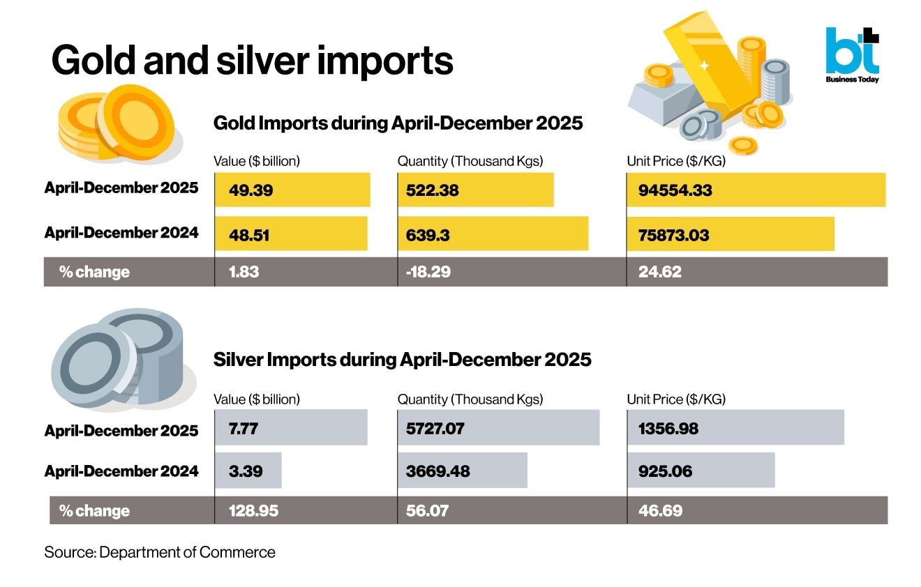 Commerce ministry officials, however, pointed out that while the quantity of gold imported between April and December 2025 decreased its price increased significantly, leading to the rise in the import bill. The quantity and value of silver imports both increased substantially. In the case of gold, between April and December 2025, imports recorded a 1.83% growth in value terms, primarily driven by a 24.62% increase in unit prices, despite 18.29% decline in the quantity.