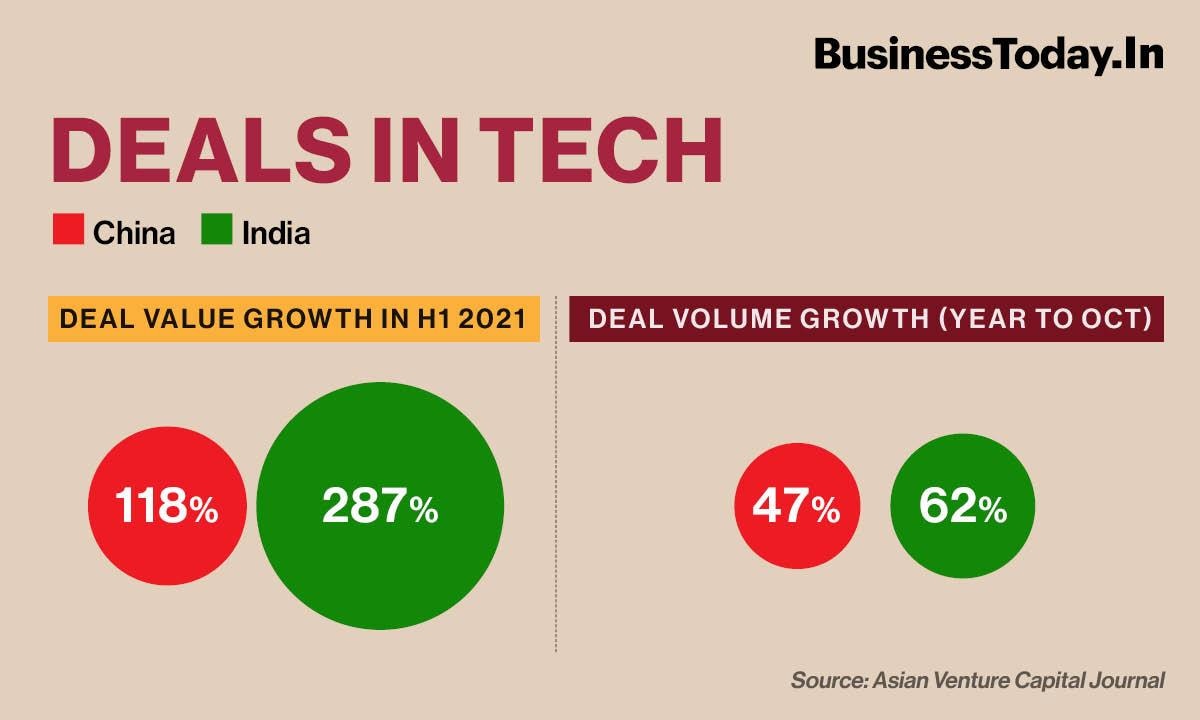 The growth slump in Chinese venture capital funding could be the result of authorities increased scrutiny of tech companies in the countryGrowth of venture capital (VC) deal value and volume in India has surpassed China's in the first three quarters of this calendar year, thanks to the rising investor caution on the neighboring country's crackdown on its technology industry.