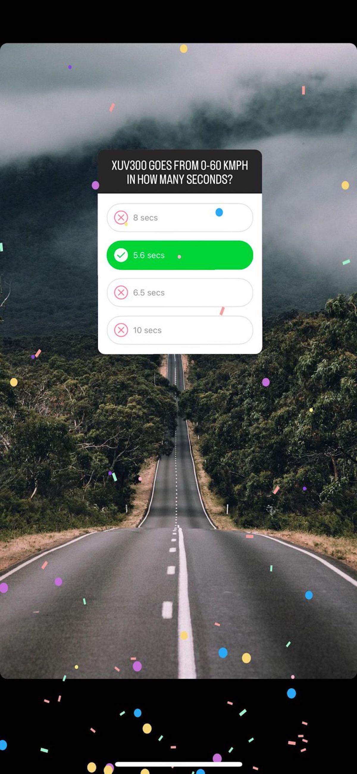 The automaker, in another slide of its Insta story, quizzed its followers and asked, “XUV300 GOES FROM 0-60 KMPH IN HOW MANY SECONDS?” with a KBC style 4 options to select from.