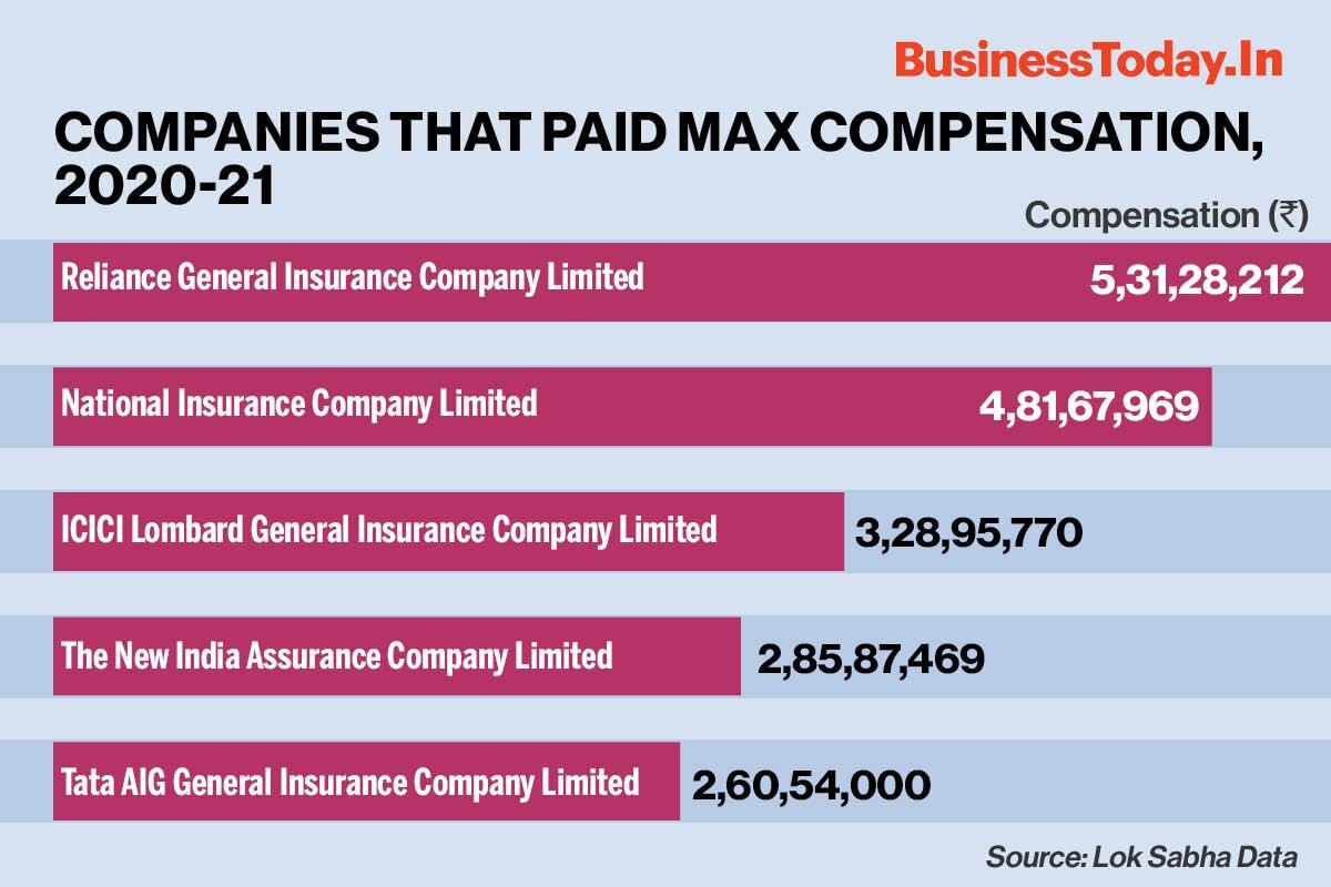 The maximum compensation paid to claimants in 2020-21 was by Reliance General Insurance Company Limited, worth Rs 5,31,28,212. This was followed by National Insurance Company Limited, which paid claimants worth Rs 4,81,67,969. ICICI Lombard General Insurance Company Limited paid Rs 3,28,95,770, The New India Assurance Company Limited compensated Rs 2,85,87,469 to the claimants, and Tata AIG General Insurance Company Limited paid Rs 2,60,54,000.