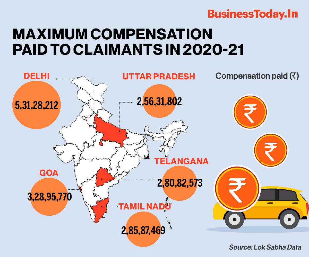 The maximum compensation paid to claimants was in Delhi worth Rs 5,31,28,212, Goa for Rs 3,28,95,770, Tamil Nadu for Rs 2,85,87,469, Telangana for Rs 2,80,82,573, and Uttar Pradesh for Rs 2,56,31,802.