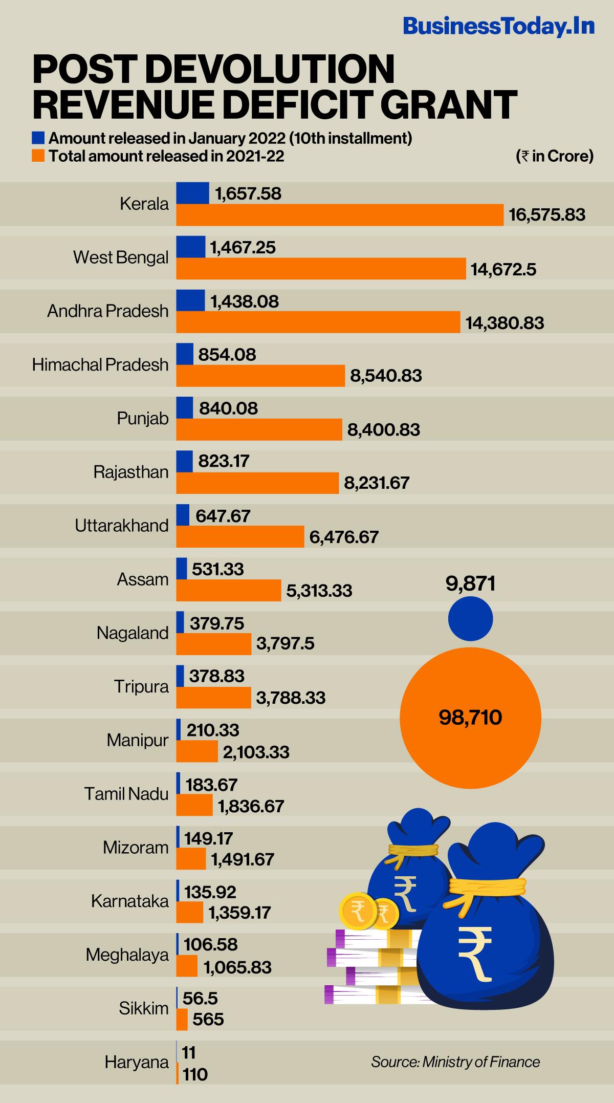 The Fifteenth Finance Commission had recommended a total Post Devolution Revenue Deficit Grant of Rs. 1,18,452 crore to 17 states in the financial year 2021-22.The Department of Expenditure under the Ministry of Finance on Thursday released the monthly Post Devolution Revenue Deficit (PDRD) Grant of Rs 9,871 crore to 17 states. This was the 10th instalment of the PDRD grant released to the 17 states.