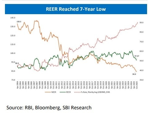 Supporting the rupee’s underlying fundamentals is valuation data. The Real Effective Exchange Rate (REER) index has stayed below 100 for three consecutive months, hitting 97.40 in September 2025, its lowest level in seven years — indicating that the rupee is undervalued rather than overextended. The Nominal Effective Exchange Rate (NEER) has also weakened to 84.6, reflecting broad-based depreciation relative to India’s trading partners.