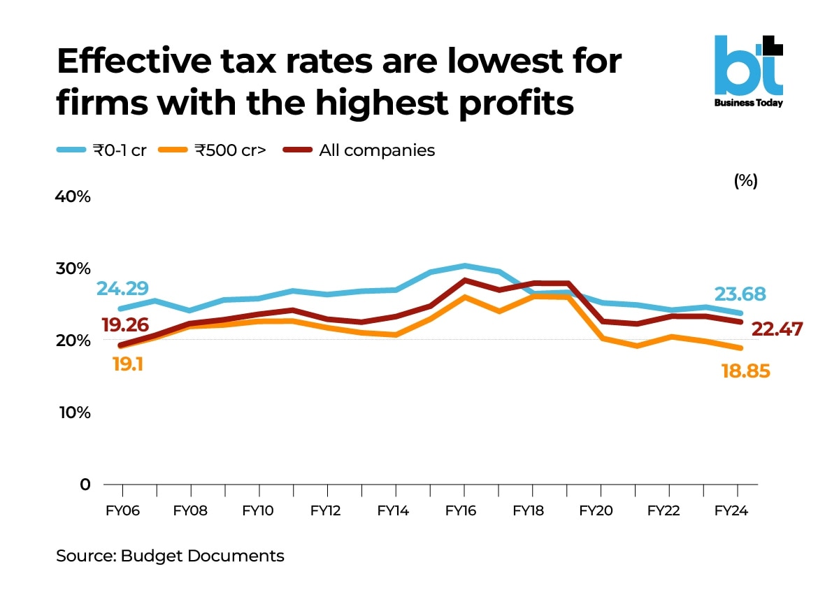 Significantly, Companies that made the most profit paid less tax than companies that made the least profit. For instance, in FY24, the effective tax rate for the companies that reported PBT above Rs 500 crore was 18.85%, which was lower than the overall rate of 22.47%, and much below the 23.68% that companies that reported PBT up to Rs 1 crore paid.