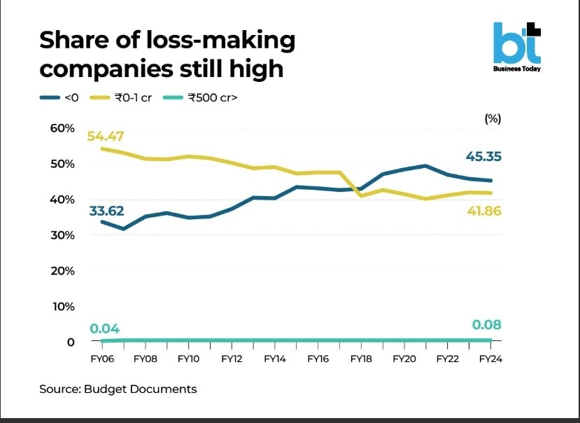 The data also show that the share of companies that reported losses rose from 33.6% in FY06 to more than 40% in FY13 and increased to 47% in FY19, rising to an all-time high of 49.6% in FY21, which was marred by the outbreak of Covid-19 and the lockdowns announced to slow the pandemic’s spread. The share of loss-making companies has dipped since then, reducing to 45.35% in FY24.