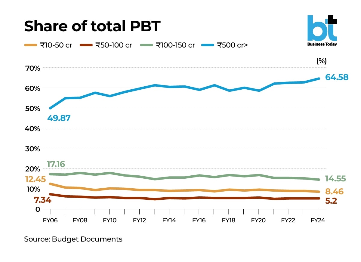 To be sure, the share of companies with PBT above Rs 500 crore has exceeded 60% of total PBT every year since FY21, hitting fresh all-time highs each year. It increased from 62.08% in FY21 to 62.54% in FY22, 62.59% in FY23, and 64.58% in FY24, according to Budget documents.