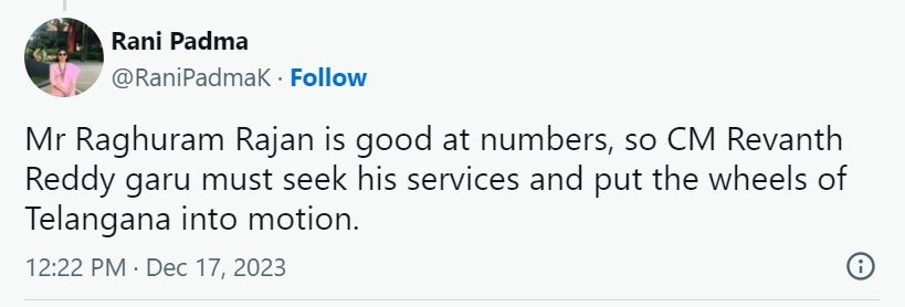 Rani Padma, another social media user, said Rajan is good at numbers, so CM Revanth Reddy must seek his services and put the wheels of Telangana into motion.