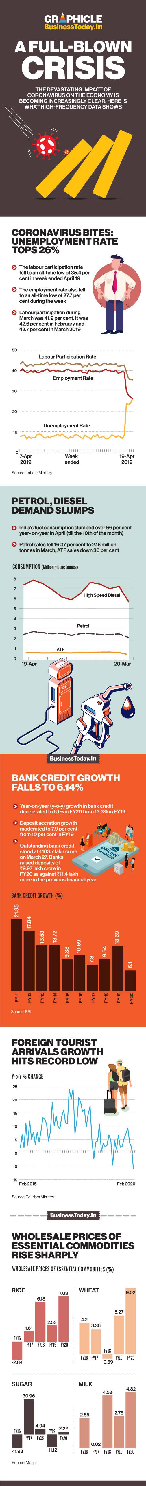 From increasing unemployment, ruining aviation, tourism sectors to a slump in bank credit and energy demand, coronavirus' impact on Indian economy has been devastating. This BusinessToday.in's infographic looks at different sectors and how badly they have been hit.