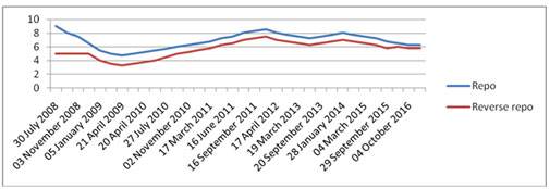 The reverse repo on the other hand increased by 25 bps in the policy review in April 2016 and was subsequently lowered to 5.75 per cent in the next policy review. Reverse repo is the rate at which the central bank borrows money from banks.