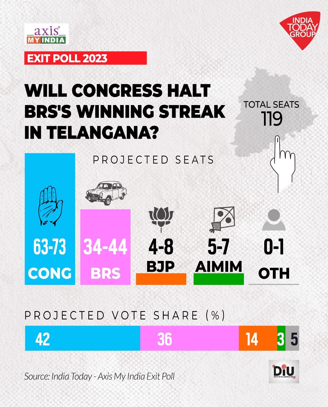 India Today-Axis My India exit poll on Friday said Congress is set to sweep Telangana with a 42 per cent vote share and 68 seats. The exit polls said the ruling BRS is expected to finsih second with 39 seats and a 36 per cent vote share.