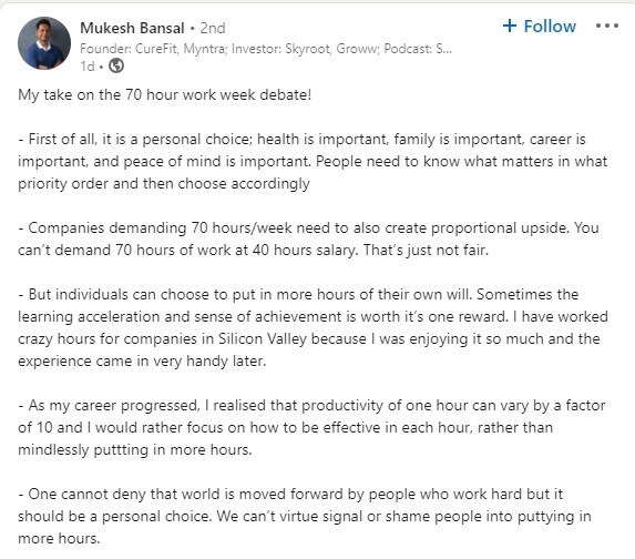 CureFit founder's LinkedIn post was a response to Infosys founder Narayana Murthy's recent advice to youngsters.CureFit founder Mukesh Bansal has also entered the 70 hour work week debate. Bansal is of the opinion that it is simply not fair to expect people to work 70 hours a week when they don't get enough salary.