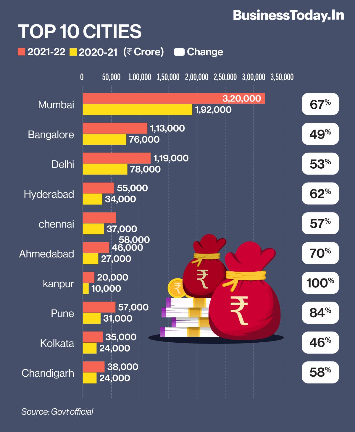 Mumbai recorded the highest collection at Rs 3.2 lakh crore, a growth of 67 per cent over last year. Bengaluru, Delhi, and Chennai posted growth in direct tax mop up by 49 per cent, 53 per cent and 57 per cent respectively.