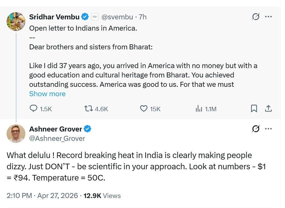 Grover reacted to Vembu's open letter to Indians in America, in which the technology entrepreneur urged members of the Indian diaspora to come back and help build India’s future.
