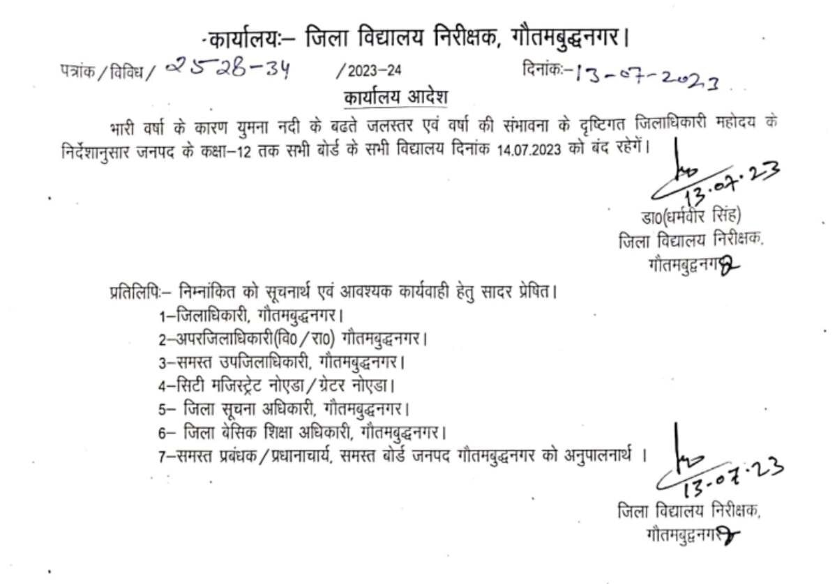 The Noida district government announced that all schools will remain shut on July 14. This decision was made in light of the Yamuna River's rising water level over the past three days and the potential for significant rainfall tomorrow.