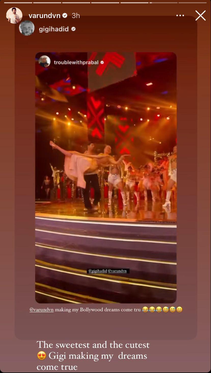 Sharing a video of Dhawan's performance, Gigi Hadid wrote, "@varundvn making my Bollywood dreams come tru (laughter emojis)." The story was re-shared by Varun Dhawan on his Instagram saying, "The sweetest and the cutest Gigi making my dreams come true."