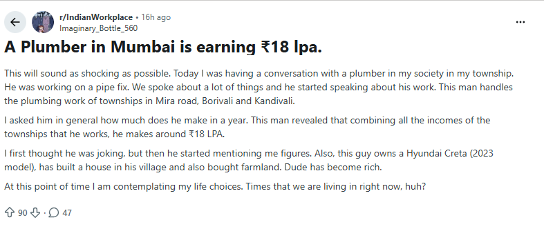 Plumber earning ₹18 LPA in Mumbai goes viralTo the shock of many online users, a Reddit user recently claimed that a plumber in Mumbai earns roughly ₹18 lakh per annum, leading to widespread discussion online.