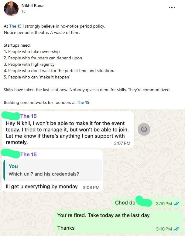 The now-viral post included a chat where the employee informed the founder that he would not be able to attend an event but was available to support remotely. Minutes later, the founder replied, "You're fired. Take today as the last day."