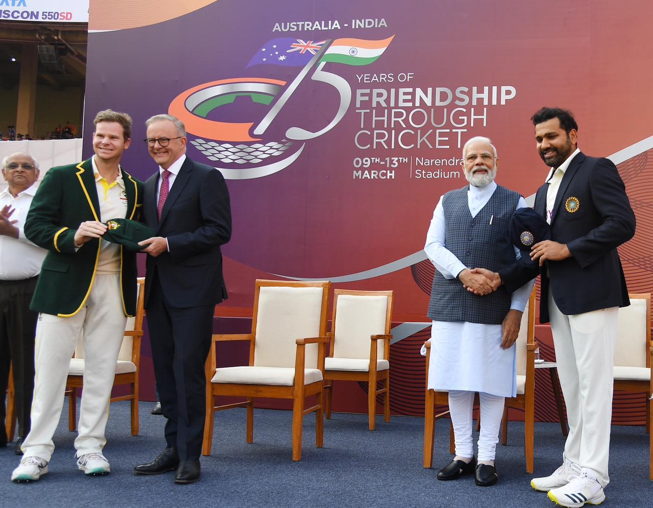 Prior to the toss, the two captains, Rohit Sharma and Steve Smith received their Test caps from their respective Prime Ministers. The exchange of caps symbolizes the beginning of the match and is a longstanding tradition in cricket.