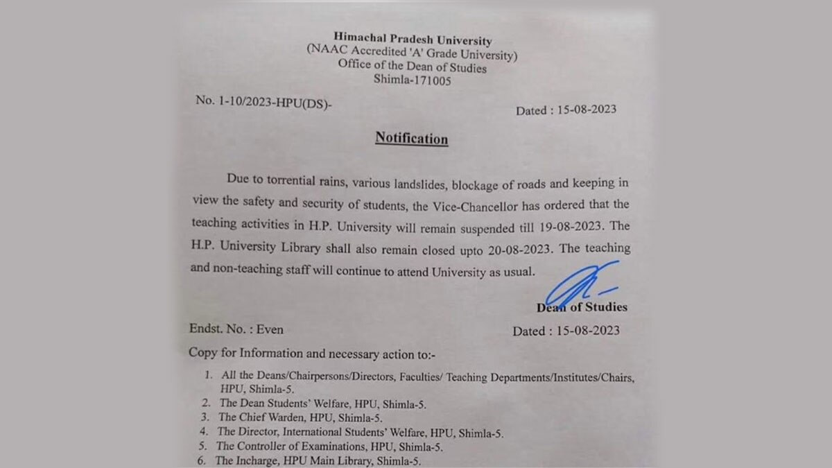 The Himachal Pradesh University’s order stated: “Due to torrential rains, various landslides, blockage of roads and keeping in view the safety and security of students, the Vice-Chancellor has ordered that the teaching activities in H.P. University will remain suspended till 19-08-2023. The H.P. University Library shall also remain closed up to 20-08-2023. The teaching and non-teaching staff will continue to attend University as usual.”