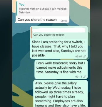 “One month into my notice period, still no salary this month. And today (Monday morning), he messages asking me to work both Saturday and Sunday and take Monday and Tuesday off instead… informing me the same day,” he wrote.