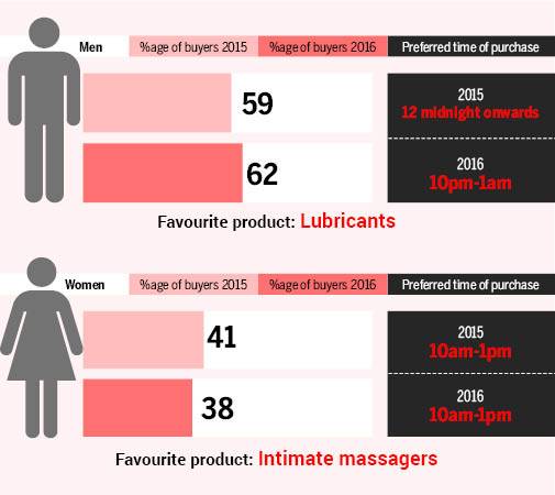 The Indian sex products industry is still a minnow, when pitted against the global size - Rs 2,500 crore domestic sex products market versus Rs 105,000 crore global sex products market. The average basket size, which was Rs 2,600 in 2015, increased by just 3.5% in 2016 - though it increases by almost a fifth during the wedding season.
