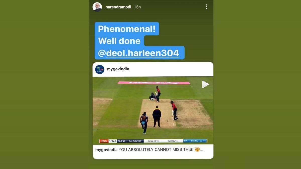 Harleen Deol's sensational catch has taken the internet by storm. The cricketer has been receiving praise from all sides for her boundary catch which dismissed England's Amy Jones. Doel even managed to catch the Prime Minister's attention. PM Modi took to Instagram to praise Doel for her superb catch. Posting an Instagram story, PM Modi wrote, "Phenomenal, well done".