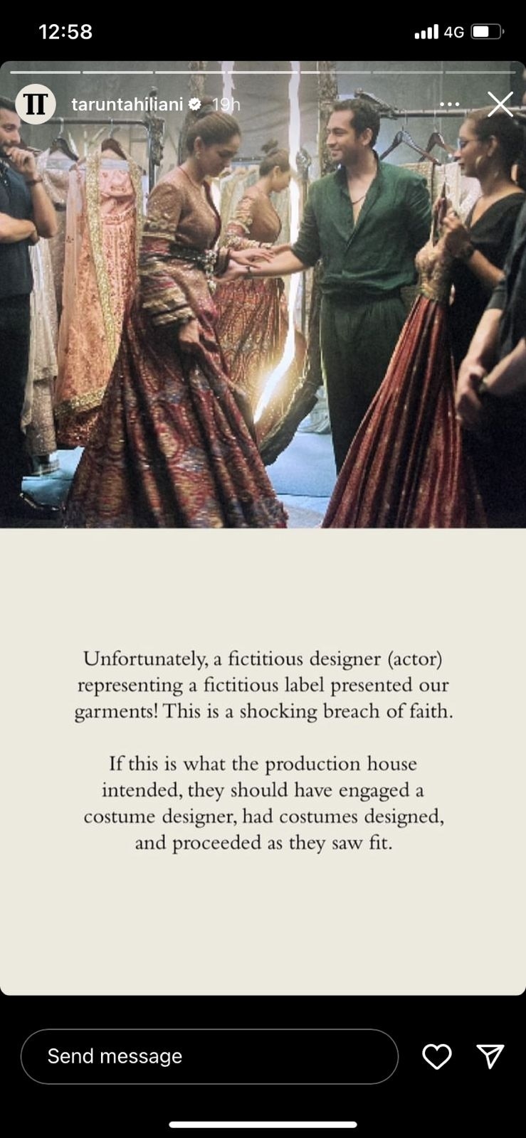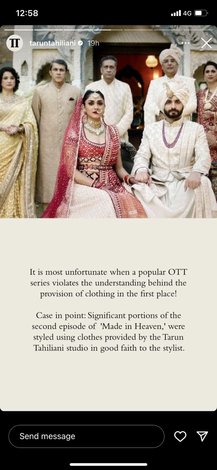 “It is most unfortunate when a popular OTT series violates the understanding behind the provision of clothing in the first place! Case in point: Significant portions of the second episode of 'Made in Heaven,' were styled using clothes provided by the Tarun Tahiliani studio in good faith to the stylist,” he wrote.