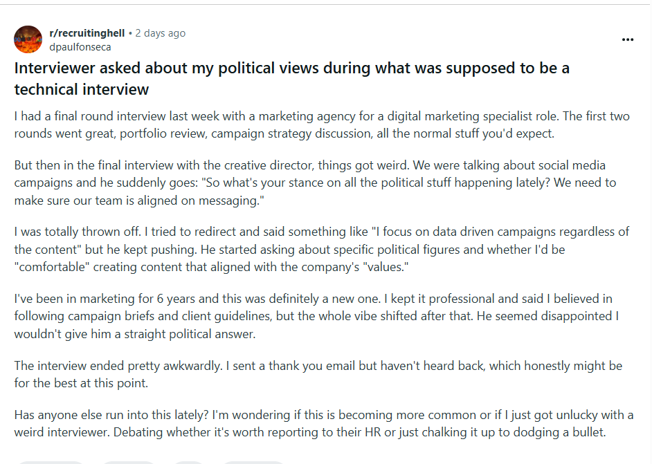The user wrote on Reddit: "But then in the final interview with the creative director, things got weird. We were talking about social media campaigns, and he suddenly goes: 'So what's your stance on all the political stuff happening lately? We need to make sure our team is aligned on messaging."