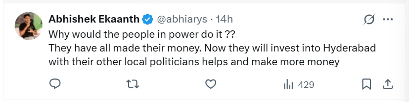 "Why would the people in power do it? They have all made their money. Now they will invest into Hyderabad with their other local politicians helps and make more money," a fourth user said.