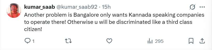 Yet another user said: "Another problem is Bangalore only wants Kannada speaking companies to operate there! Otherwise you will be discriminated like a third class citizen!"