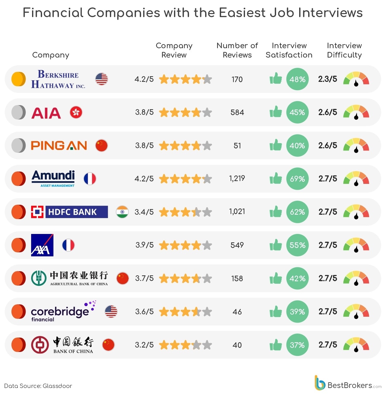 An analysis by BestBrokers, based on Glassdoor data, examines how difficult it is to secure roles at the world’s largest publicly traded financial firms.