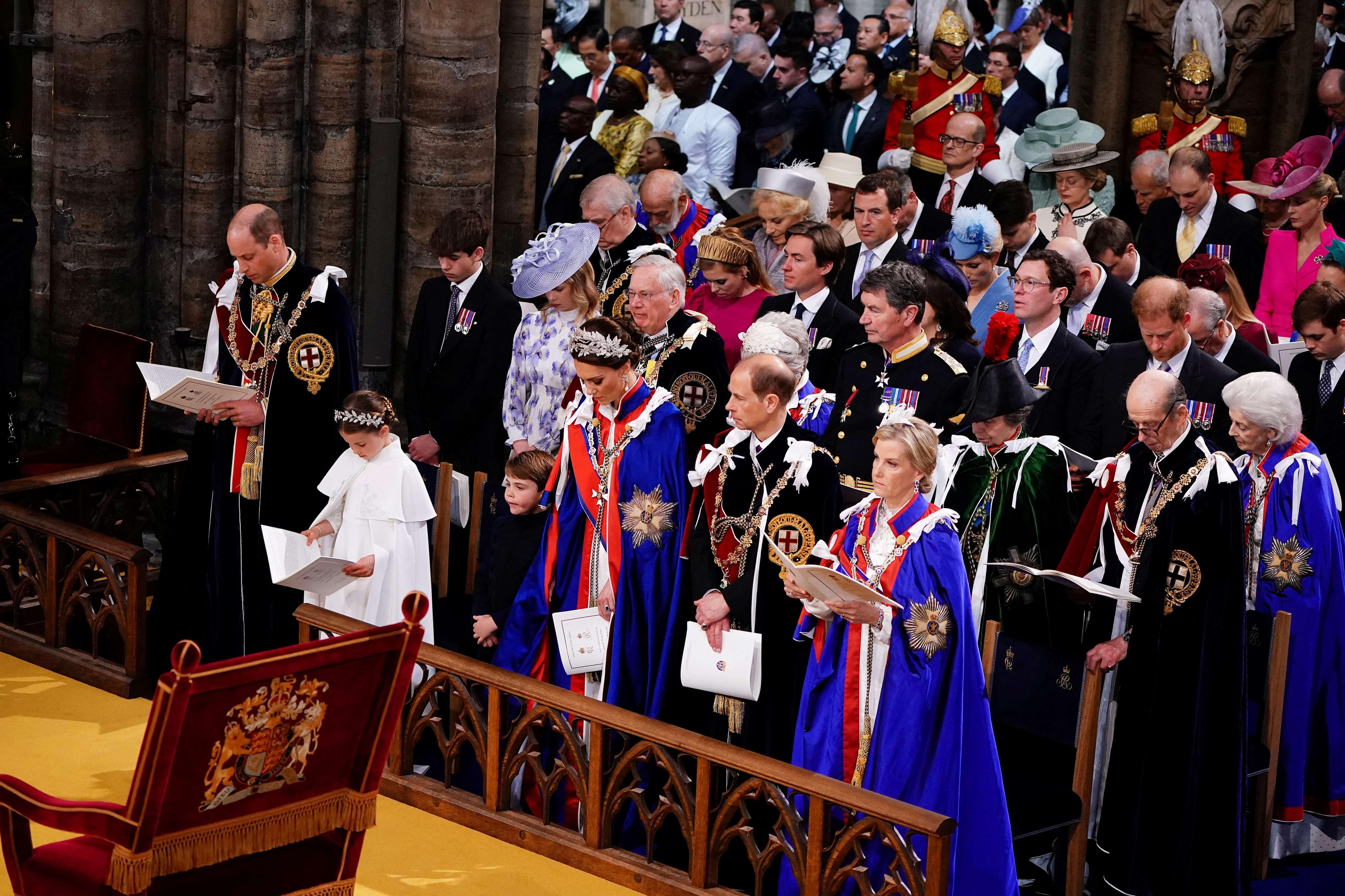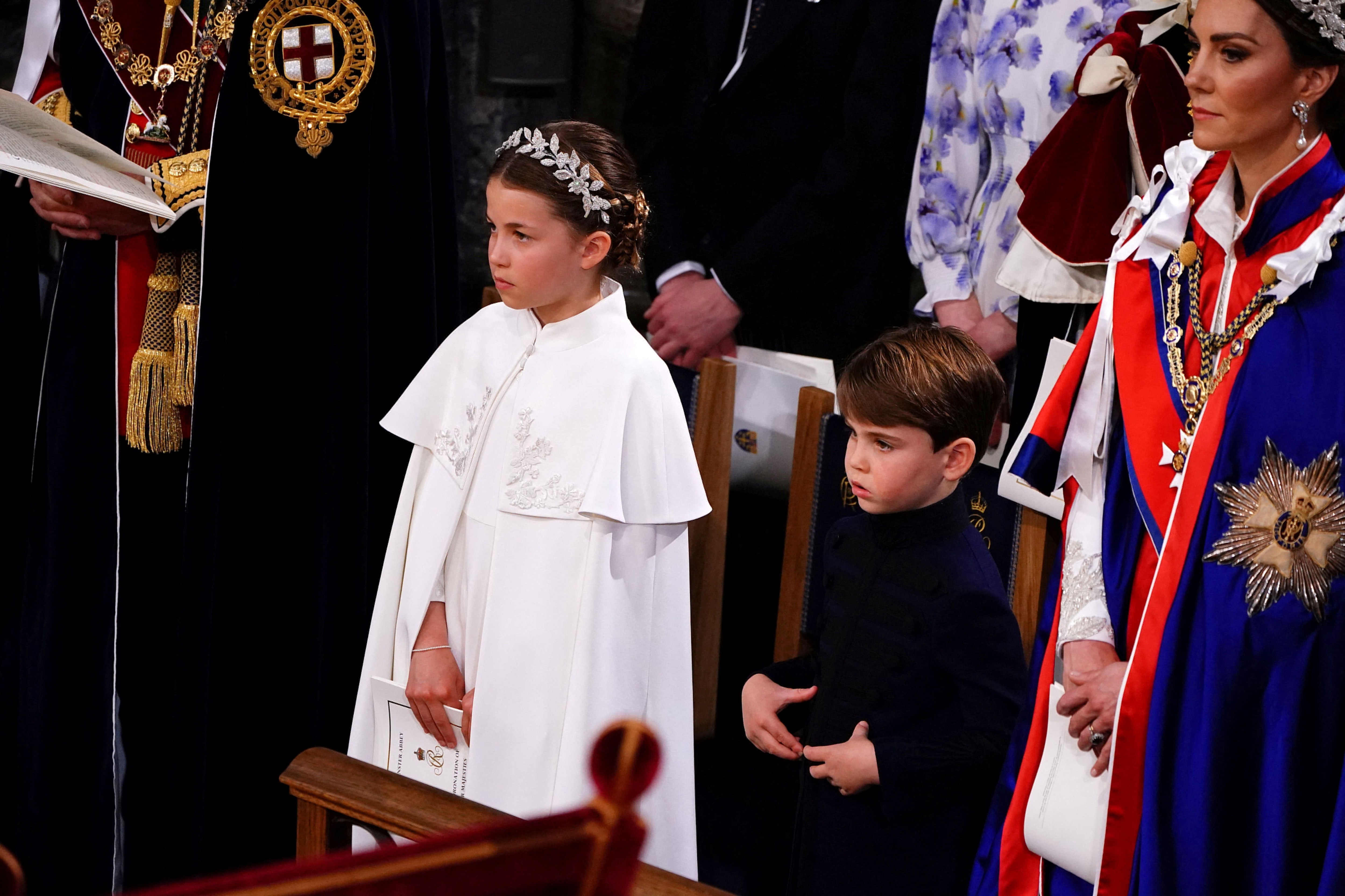 Here are some images showing the Prince and Princess of Wales, alongside their kids and other high-ranking members of the royal family, observing the coronation ceremony.