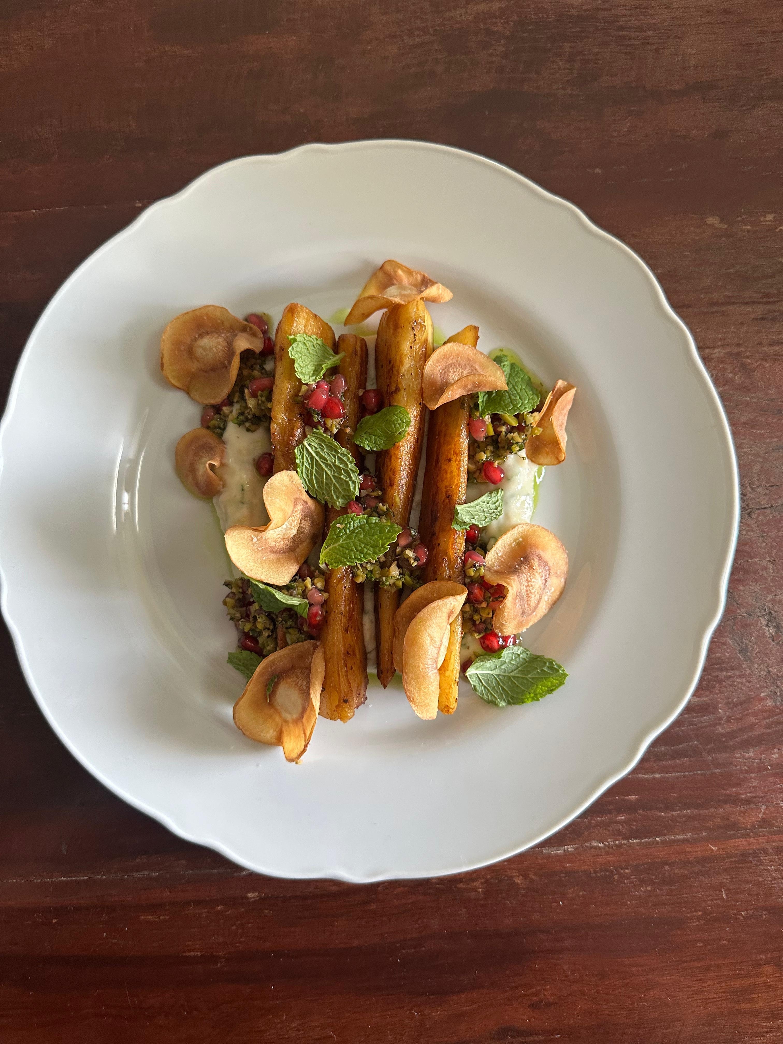 Even parsnips get a creative twist. Talking about the process of bringing their collective knowledge and experiences to the plate, Pallavi said, “At NĀVU, we love texture and using the same ingredient to create multiple textures within the same dish… Many don’t realise the parsnips are very versatile and can be used for anything, ranging from an ice cream to a warm soup. Confit parsnips on a velvet-like purée made with parsnips and milk, garnished with crisp chips that are almost sweet, reminiscent of almonds. This layering unlocks a sensory experience that reflects its versatility and amplifies its subtle flavours using different cooking techniques.”
