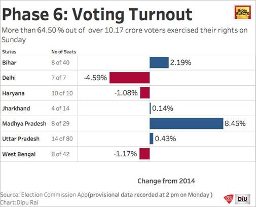 Lok Sabha Elections 2019Phase 6 of the Lok Sabha Election 2019 concluded on Sunday with a voter turnout of 63.3 per cent. Elections were conducted across 59 parliamentary constituencies in seven states. The highest voter turnout was recorded in West Bengal with 80.35 percent, while Delhi recorded a low turnout of 59.74 per cent. Haryana, Uttar Pradesh, Bihar, Jharkhand and Madhya Pradesh recorded 68.17 per cent, 54.72 per cent, 59.29 per cent, 64.50 per cent and 64.55 per cent respectively.
