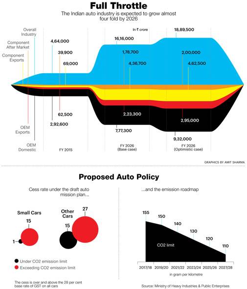 Yet, the industry has only scratched the surface of the huge potential that exists. India, at just 24 cars per thousand people, compared to 500 for developed economies and a world average of 170, has a long way to go before the market begins to saturate. The government's own projections for the next decade under the Auto Mission Plan 2016-26 (see Proposed Auto Policy), sees turnover grow more than three-fold between `16,16,000-18,88,500 crore based on an average GDP growth of between 5.8-7.5 per cent. That would generate over 65 million jobs, direct and indirect, over and above the 25 million generated in the previous decade.