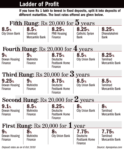 After a year, when the one-year deposit matures, reinvest the proceeds in a five-year deposit. By then, all the other FDs would be a year closer to maturity. This iron-clad approach is known as laddering. It helps you get the best returns without exposing you to the interest rate risk.