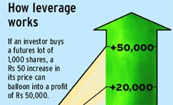 • Futures contracts are leveraged instruments. The investor pays just 20-25% of the value of the transaction as margin money. A 1% change in the share’s value means a 4-5% change in the value of the contract. The loss incurred is deducted from the margin and the investor is asked to pay the additional margin. If he can’t pay, the shares are sold.