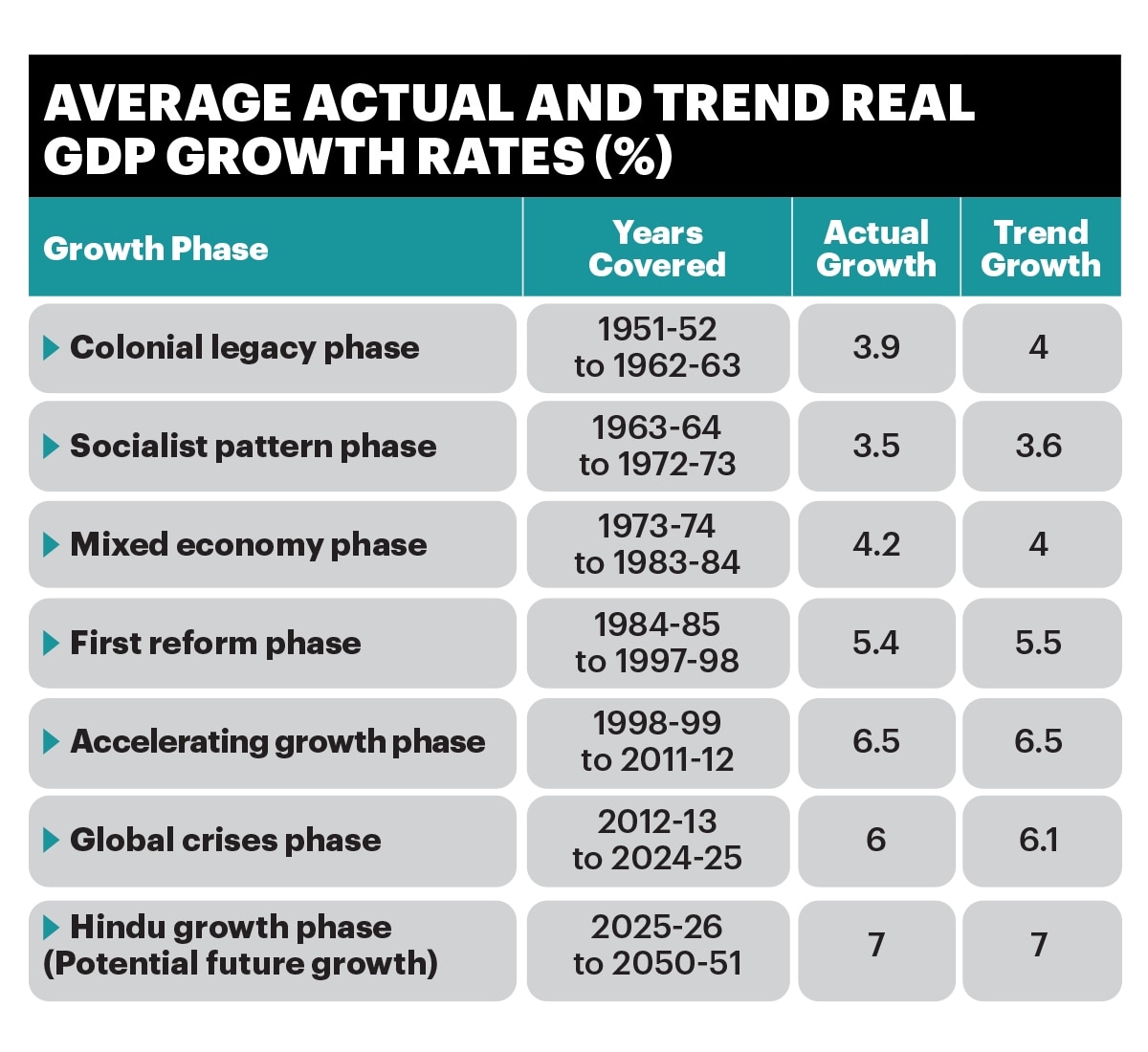 The book is co-written by veteran economist DK Srivastava, who is Chief Policy Advisor at EY India, and was a member of the Twelfth Finance Commission and the Advisory Council to the Sixteenth Finance Commission, along with his colleagues at EY, including Muralikrishna Bharadwaj, Tarrung Kapur and Ragini Trehan. It provides a summary of India’s economic growth rates over the past 75 years and the potential for the next 25 years while tracing the average GDP growth over seven time periods, coinciding with various phases in the economy (see chart).