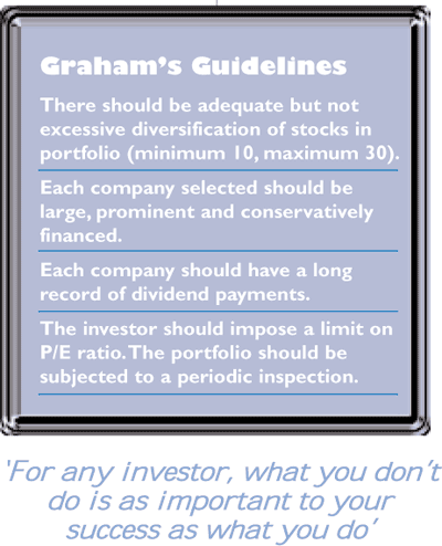 Rules set out by Graham for his preferred “defensive investor” are simple yet strong. One, there should be adequate though not excessive diversification of stocks in one’s portfolio (minimum 10, maximum 30). Two, each company selected should be large, prominent and conservatively financed. Three, each company should have a long record of dividend payments. And four, the investor should impose a limit on P/E ratio. In addition, the portfolio should be periodically inspected.