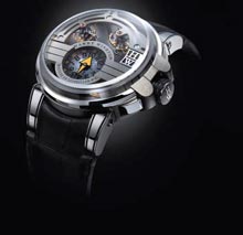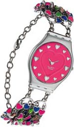 Fashion designer Manish Arora combines bright colours, intriguing shapes and his signature kitschy style to create Skin, a watch bracelet for Swatch. Clusters of heartshaped arms in stainless steel and white crystals line the bracelet and shiny silver appliqué hearts of different sizes mark all hours.