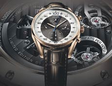 The Watch and Jewellery Show Baselworld 2011, Switzerland witnessed the launch of a magnificent timepiece which immortalises the King of Macedon, Alexander. The 'Alexander the Great Westminster Carillon Tourbillon Jaquemarts Minute Repeater' is set in 18K white or rose gold and touts a complicated mechanism. It features five handcrafted figures on the dial depicting Alexander the Great clad in armour and engaged in battle. While the engraving stands armed on horseback with a spear on one movement, it stands mutinous with bow and arrow on other. These battle engravings are synchronised with the sound of gongs, moving to the minutes, quarters and hours. Hand finished and adorned with 36 jewels, the movement looks striking against the deep charcoalcoloured background of its manmade polycrystalline diamond dial. A thing of beauty, it also has a 70-hour power reserve. Website: www.ulyssenardin. com