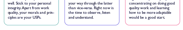 | You are on the right track. You have come to the new job knowing very well how critical first impressions are to a sustainable relationship. You intuitively know the importance of coming across as a professional and committed employee who takes his work seriously. You definitely are giving the right signals by having a positive attitude, getting to know your colleagues, not rubbing anyone the wrong way and steering away from office politics. Your actions are building on your credibility. You are right now like a sponge, observing everything around you before deciding how you want to be. Smart move. Keeping in mind that you are new and still trying to understand the environment keep the self-focus low. Now that you have been officially accepted, you would want to: • Sustain the first impression which you have been able to create. This does not mean that you need to be scared of the office bully. But surely now you will know how to tackle him. • Sometimes hitting the table tennis room would do you good. • Establish rapport with your colleagues— this will now help them understand you as an individual. You eventually will be accepted as “one of them”. This helps in situations where your opinion differs. | You want to create a favourable impression. The only issue is, you want to take the short cut. Nobody expects you to knock their socks off in the first few weeks. You can take some time to create a powerful impact. Meaningful and sustainable relationships are created when there is a strong foundation of proven worth and trust. For these two factors you will have to work harder. You would want to focus more on increasing your reliability quotient. Create trust in people through the work you do. If you want to create a good impression, be authentic about it. This way you will come across as genuine. For the initial period, you would want to withhold your reactions. You don’t want to be in the bad books of anyone. But you cannot please everyone at all times. After all, your credibility is still to be fully established. Avoid being casual in your communication and behaviour. You would also want to: • Take more responsibility. • First be part of the team before carving your own individuality. • Take your time to understand people around you. • Avoid situations which can offend others. You still don't know how the system works. In the initial period, let your work speak for you. | You want to be different. Unfortunately, that works best in a costume party. It is recommended that you understand what kind of signals you are sending to the environment which is more than eager to form an impression of you. Right now the signal that you might be sending out is that people need to adapt to you and not the other way round. To do anything different, you have to be an accepted part of the system. Understand the norms that exist and adhere to them. Being indifferent is not what you aim to be in your new job. That’s a reputation which is best avoided. First impressions about you and your future potential can make a major impact on your future success with the organisation. Hence, tread carefully. • You need to build trust. Trust can be only created if your credibility, reliability and intimacy levels are established. You would want to focus on all three with a lesser focus on yourself. • Learn to be more adaptable to new surroundings. • Concentrate on your work and avoid getting involved in office politics for as long as you can. That never did anyone any good. • We seldom work in isolation. Avoid letting other people elicit any emotional reactions from you. |