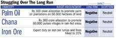PALM OILIndia is one of the largest importers of vegetable oils. Ignoring expectations of an import duty cut-currently at 7.5%-in this budget, Mukherjee, instead, decided to earmark 60,000 hectares of land and Rs 300 crore for palm oil production to meet the ever-increasing demand. The initiative is expected to yield about 3 lakh mt of palm oil annually in the next 5 years.