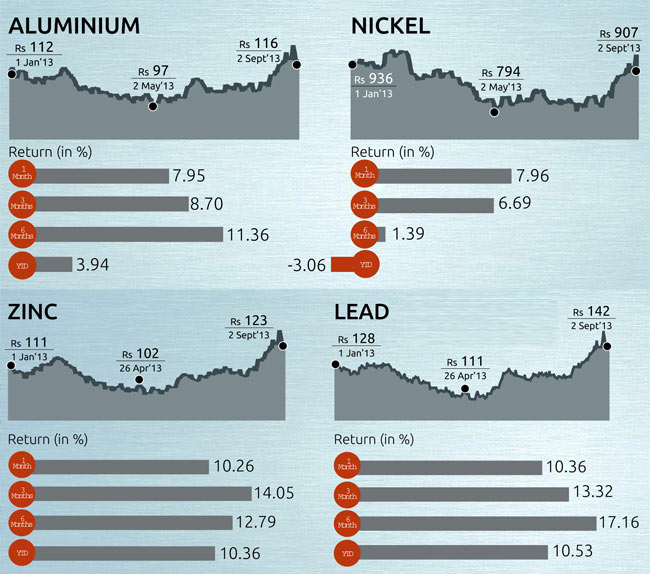 Nickel: After a disappointing 2012, nickel continued to fall in the first few months of 2013. It hit a fouryear low of $13,205 in global markets in June. In India, it fell 13% to Rs 816 per kg between January 1 and June 29. However, global factors pushed up prices by 12% to Rs 915 per kg in July-August.