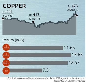Copper: More than half the copper produced in the world is used to make electric wires. Prices have of late risen sharply in both domestic and international markets. The rise on the LME was over 7% between May and August. On the MCX, it was more sharp (27%), from Rs 281 per kg on May 1 to Rs 484 per kg on August 30.