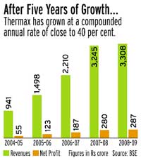 Thermax hopes to address customers with innovative approaches in services like energy rentals, process efficiency tracking at boiler sites, equipment life extensions, and operation & maintenance of power plants; it is also exploring other service revenue opportunities. The internal target is for services to contribute 15 per cent by 2012. Says Misal Singh, an equity analyst who tracks capital goods at Edelweiss Capital: “While the services business can grow at a high rate, it is unlikely to contribute anything beyond 15-20 per cent of the sales over the long term.”